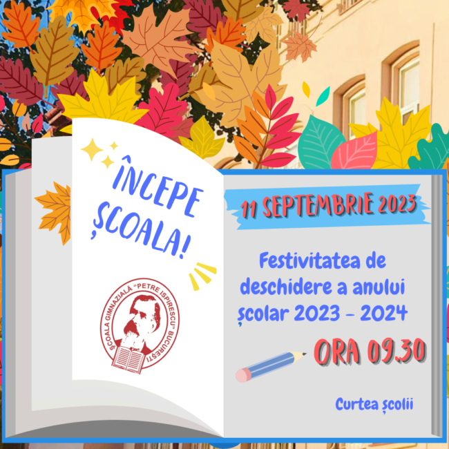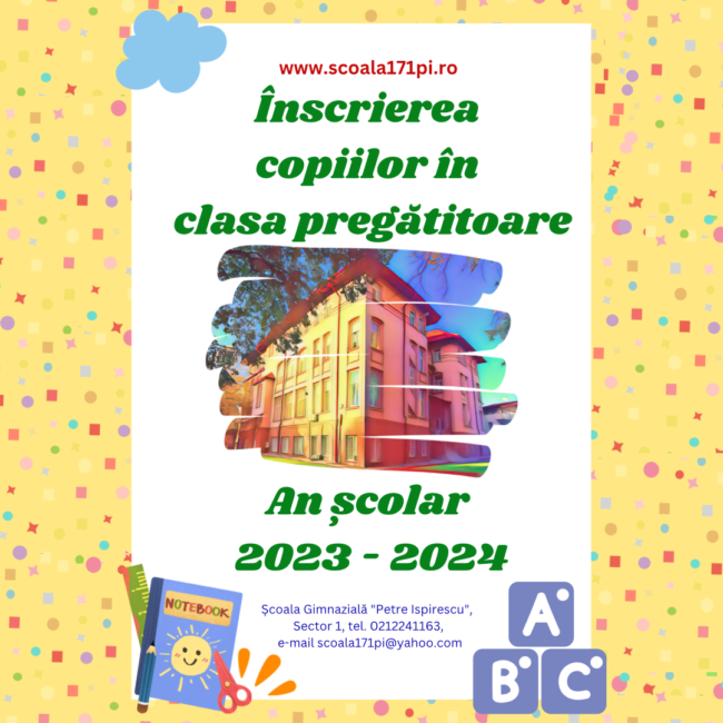 Înscrierea copiilor în clasa pregătitoare Anul școlar 2026–2027 Școala Gimnazială „Petre Ispirescu” din București îi așteaptă pe viitorii elevi ai claselor pregătitoare! Perioada de completare a cererilor de înscriere: 31 martie – 6 mai 2026 2 clase pregătitoare 48 de locuri disponibile Cererile pot fi depuse online, pe platforma Ministerului Educației și Cercetării, sau fizic,…